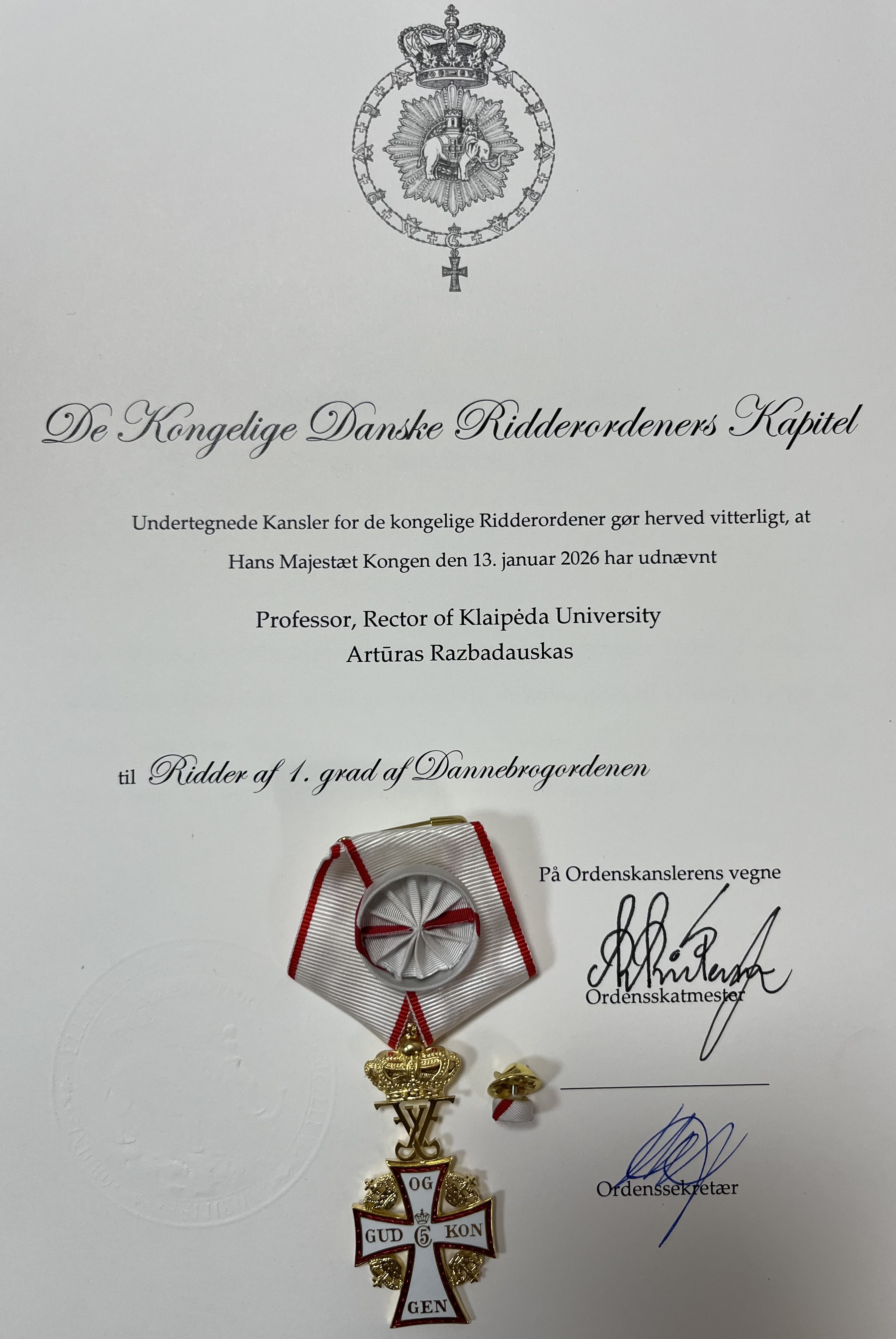 The insignia of the Order of the Dannebrog is awarded to individuals whose activities contribute to strengthening international relations, fostering trust-based dialogue, and developing long-term partnership initiatives between countries. The award serves as an expression of gratitude for services rendered to Denmark. Established in 1671, the ribbon of the Order reflects the colours of the Danish flag – white and red. This honour highlights the role of the Rector of Klaipeda University in building sustainable academic bridges between Lithuania and Denmark.